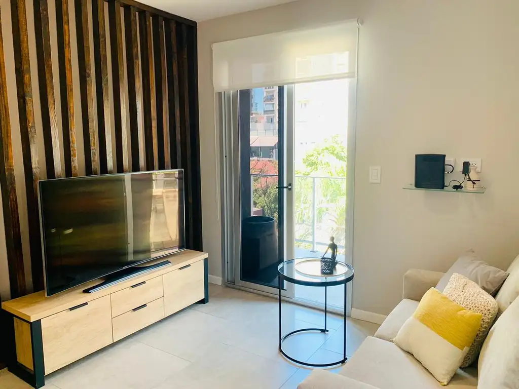 La unidad consiste en un living comedor totalmente equipado con sofá de dos cuerpos, Smart Tv curvo, Split frío calor y salida a dos balcones.
