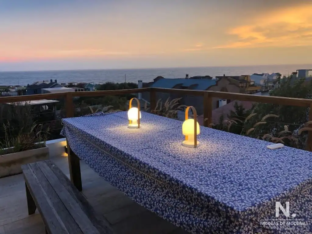 Amplio y luminoso Living - Comedor con vista al mar, cocina integrada.
