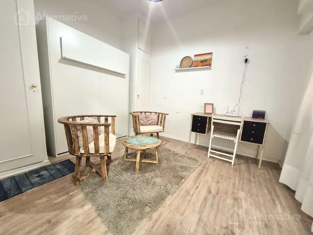 El departamento se alquila totalmente amueblado y equipado para una estadía cómoda: cuenta con cocina integrada, baño completo y un ambiente luminoso con espacio de descanso y trabajo.