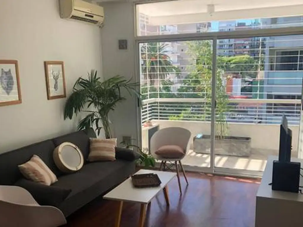 LIVING: sofá cama de 190 x 80, biblioteca, una mesa con 6 sillas, Aire Acondicionado, TV smart de 32, Ventanal luminoso con vista abierta y salida al Balcón.