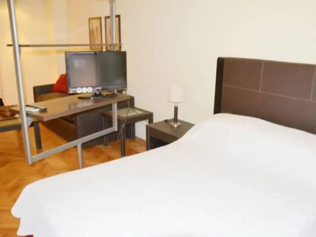 El departamento es un studio divisible que cuenta con una cama tamaño queen, placards muy amplios, sala de estar con un sofa de alta calidad, mesa ratona, escritorio con una silla, tv 32" con giro pudiendo verlo desde la cama o desde el sofa, baño nuevo completo, y una cocina amplia con comedor diario.
