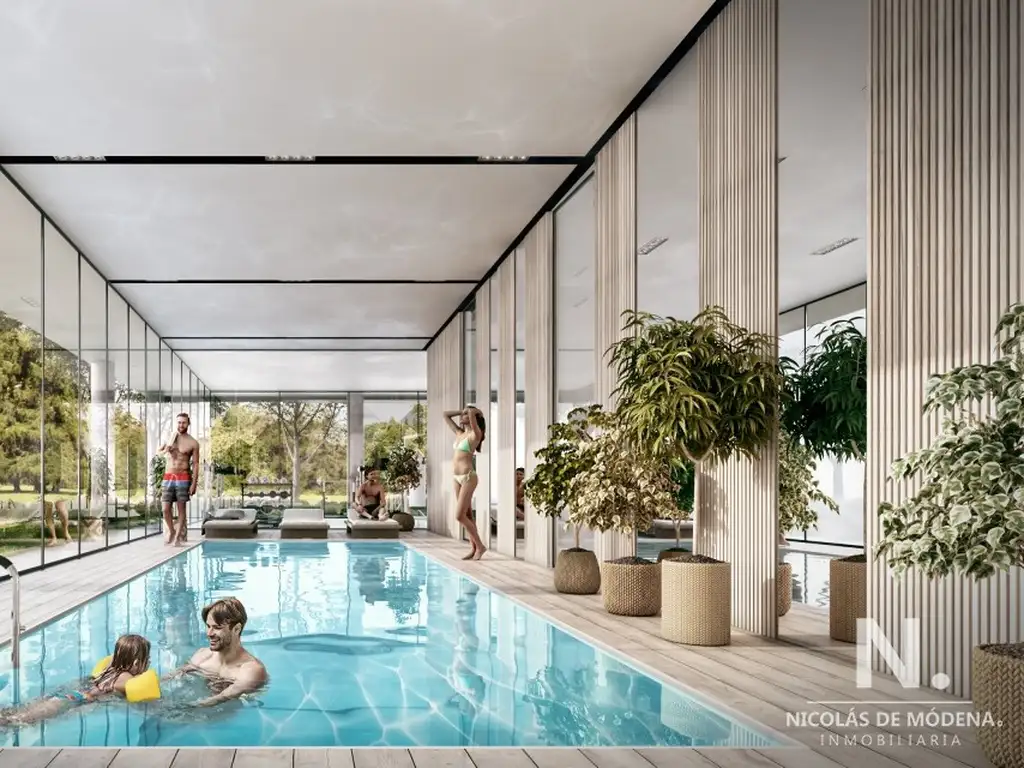 Amenities: 2 barbacoas cerradas- playroom -piscina interior-gimnasio áreas de servicios correspondientes como vestidores-depósitos-deck-solarium - piscina exterior-espacios verdes enjardinados que rodean al edificio.
