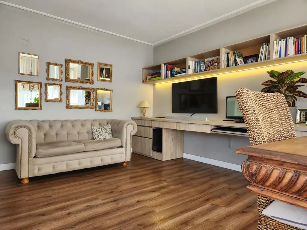 Cuenta con dos baños, dos balcones (principal al norte y secundario al sur), cochera en planta baja, muebles de cocina con mesadas en silestone, pisos de alto transito con zócalos en PVC, dos hornos Ariston (uno micro ondas), anafe electroluz a inducción, dos aires acondicionados, doble cortinado en todas las aberturas, griferías fv, todos los artefactos de iluminación, luz difusa ornamental.