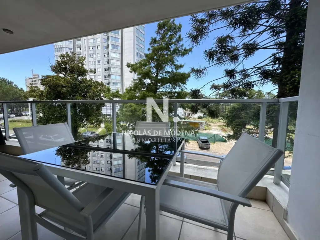 El diseño interior incluye una cocina definida, un amplio y espacioso living comedor, proporcionando múltiples áreas para el entretenimiento y la convivencia. El apartamento está equipado con todas las comodidades necesarias para una estancia confortable, como anafe, microondas, lavavajillas, heladera con freezer, tostadora, aire acondicionado, televisión y más.
