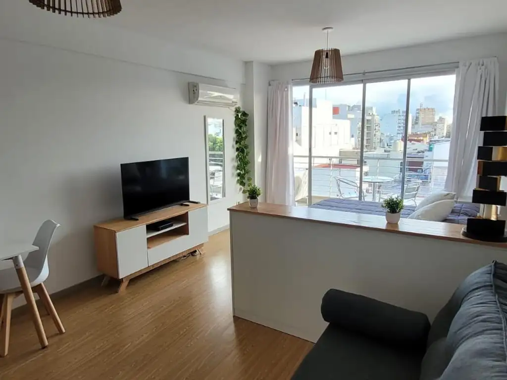 El departamento cuenta con sector de living con mesa con dos sillas, mueble de televisión, Aire acondicionado, sillón, sector de habitación con cama de dos plazas, mesa de luz con porta lampara, placard, sector de cocina con alacena, bajo mesada, heladera con frezzer, microondas, anafe, lavarropas automático, utensilios de cocina pava eléctrica. Baño con inodoro, bidé, lava manos con espejo, ducha.