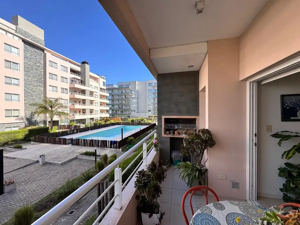 El espacio se conecta con un balcón al frente, de gran tamaño, con vista abierta a la pileta descubierta del complejo.