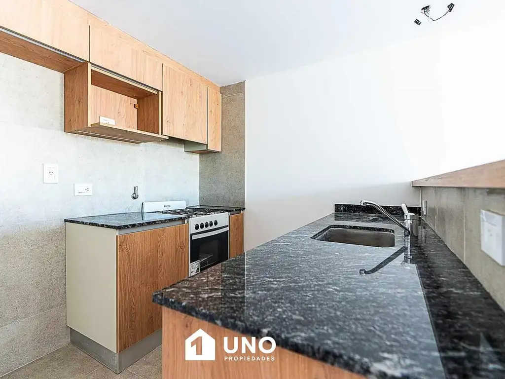 Departamento externo a estrenar. Amplio ambiente único con balcón al contrafrente, cocina semiseparada por desayunador, conexión para lavarropas y baño.