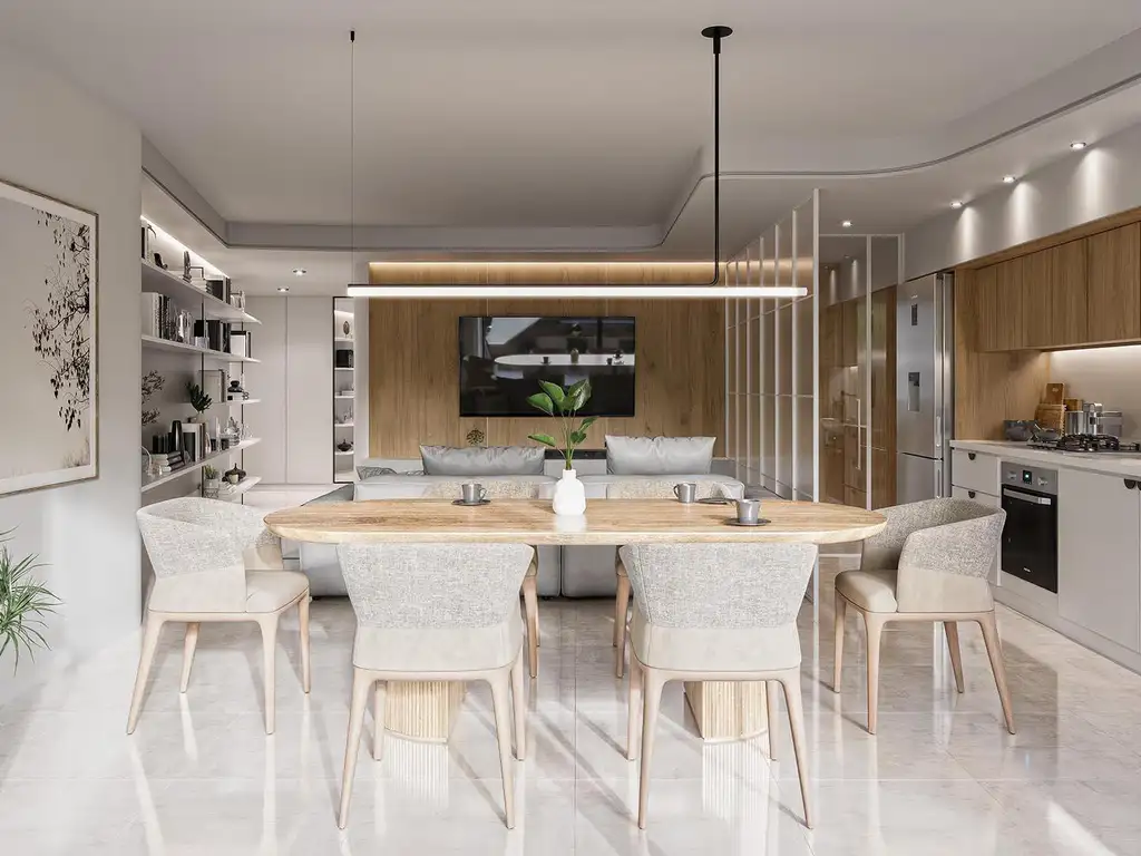 Unidades de 1, 2 y 3 dormitorios cuidadosamente diseñadas con detalles minimalistas que crean una sensación de serenidad y sofisticación. Amplias ventanas que permiten la entrada de abundante luz natural, realzando la belleza de los acabados. Ya sea una acogedora sala de estar, una cocina equipada con electrodomésticos de última generación o dormitorios tranquilos, estos departamentos ofrecen un estilo de vida moderno y cómodo que se adapta a las necesidades de sus residentes. Unidades al contrafrente norte de 3 dormitorios con piletas exclusivas, unidad de 1 piso con gran patio, quincho y pileta exclusiva, además las 2 unidades del piso 6 cuentan con terraza exclusiva con piletas propias y parrilleros (una es de 2 dormitorios y la otra de 4 dormitorios). Excelente calidad constructiva con doble muro compuesto aislado para máxima calidad térmica en medianeras, terminación con yeso en paredes y cielorraso, aberturas de WPC con vidrios DVH (doble vidriado hermético), puerta de seguridad de ingreso a departamentos con tecnología de avanzada y ceraduras triple anclaje, puertas interiores de alta prestación con marcos y hoja de WPC, con herrajes de tecnología, hermeticidad y alto peso específico; pisos, revestimientos y zócalos de porcelanato de primera línea, placares completos, con frente, fondos y laterales en madera revestidos en su totalidad, equipados en su interior con divisiones, cajoneras y barral, canteros integrados a la estructura del edificio, provistos de vegetación y automatizados con riego por goteo, estructuras metálicas con vegetación, iluminación en cielorraso, provisión de canilla de servicio de agua y toma de electricidad, preinstalación de aire acondicionado en todos los ambientes y puerto USB en dormitorios, caldera dual y radiadores, preinstalación de A/A, mobiliario de cocinas completos con alacenas y bajo mesadas de diseño: MDF 18mm laminados con filos de PVC 2mm inyectados, zócalos de acero inoxidable o similar, iluminación en mobiliario, mesadas con regrueso, bacha de acero inoxidable con griferías, horno embutido (eléctrico) y anafe (a gas) separados sobre mesada, espacio provisto para purificadores de aire, diseño de iluminación en cielorraso. Sanitarios y griferías de primera marca, bañera sin mampara o receptáculo de ducha, vanitory de diseño o mesada de mármol con bacha de apoyo, accesorios de baños y espejo retroiluminado, diseños en cielorraso con iluminación difusa. Alarma, sensores de humo y cámaras de seguridad.