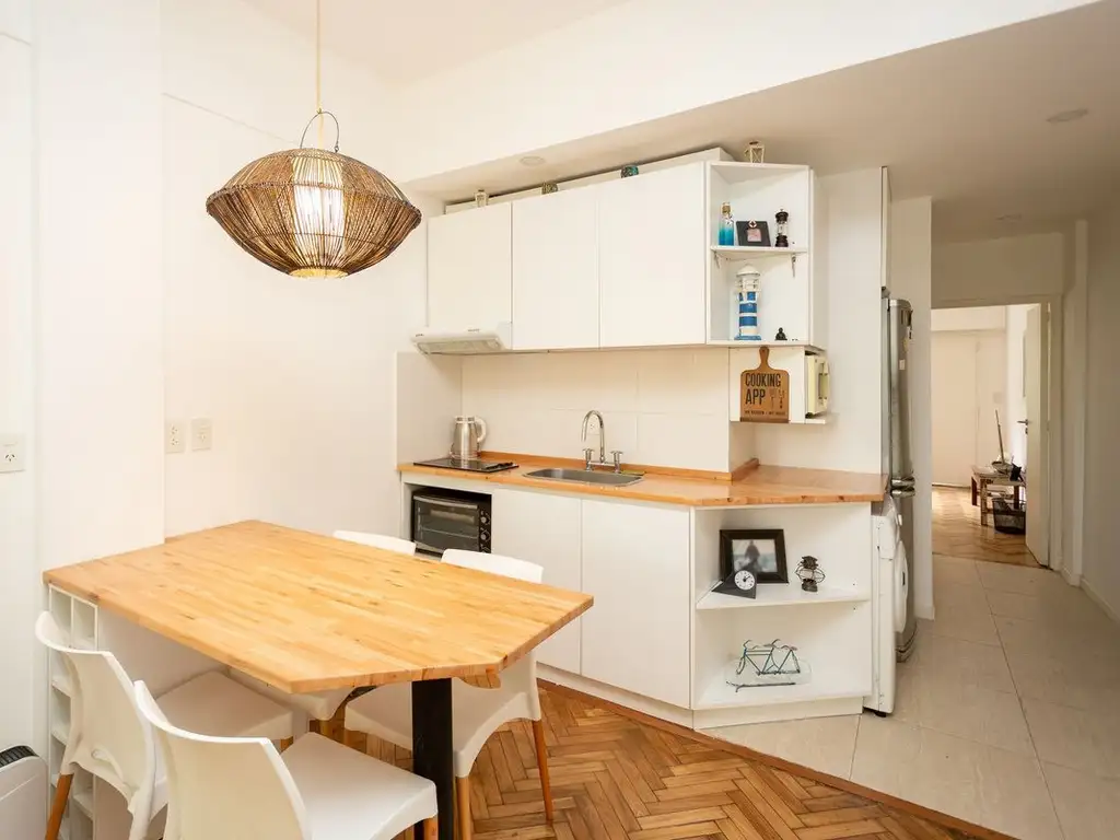 Cuenta con una cocina abierta incorporada con mesa amurada de madera que combina perfecto con la mesada y el piso del living, todo en perfecto estado de mantenimiento. Con suficiente lugar de guardado, muebles de sobre y bajo mesada nuevos. Conexión para lavarropas.