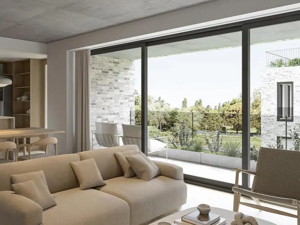 Ingreso a amplio estar-comedor con salida directa a amplio balcón hacia el verde. Cocina integrada con isla y lavadero independiente. Dos dormitorios. Buena ventilación y luz natural en todos los ambientes principales.
