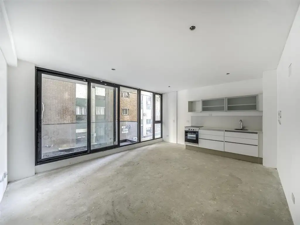 Unidad de 2ambientes de 49m2 totales. Cuenta con 1 dormitorio en suite, cocina integrada y living. Departamento moderno, luminoso. -Agua caliente central. -Canalización para cañería refrigerante de aire acondicionado -Calefacción por losa radiante o piso radiante central o individual con fuente de energía a gas Cuatro ascensores de amplias dimensiones, de reconocida Carpintería de Madera Puertas de acceso a las unidades enchapadas en madera o pintadas. Herrajes de primera calidad. Frente de placards en hojas corredizas de piso a techo, hoja de espejo o melamina blanca. No se proveen interiores. Pisos y paredes de Unidades: Carpeta de cemento preparado para recibir alfombra o piso flotante a proveer y colocar por el comprador. Grifería FV o similar. ArtefactosMesada y bacha de losa