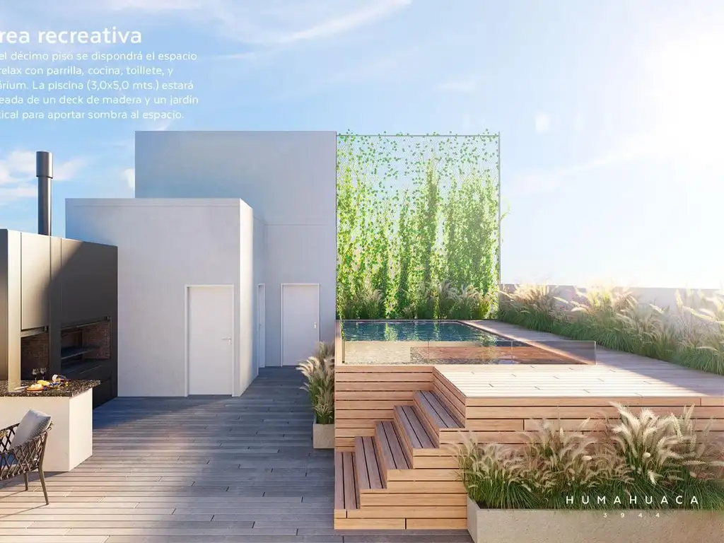 - piscina con espacio verde, solárium, deck, jardín vertical lateral espacio de parrila con cocina, toilette y mesada de mármol;