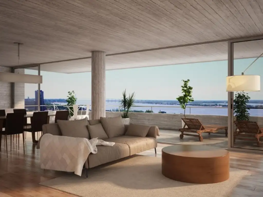 Terraza al norte con vista al río. Balcones con vista a la ciudad. Interiores de hormigón visto. Ventilación cruzada. Pisos de ingeniería en estar, cocina y dormitorios. Aberturas de aluminio negro con vidrios DVH. Calefacción por piso radiante. Pre instalación de aire acondicionado. Dormitorio principal en suite con vestidor. Baños con mesada y piso de mármol de Carrara. Cocina con isla y mueble de guardado de piso a techo. Horno y anafe eléctrico. Lavadero y despensa. Iluminación: artefactos de balcones, tomas y llaves.