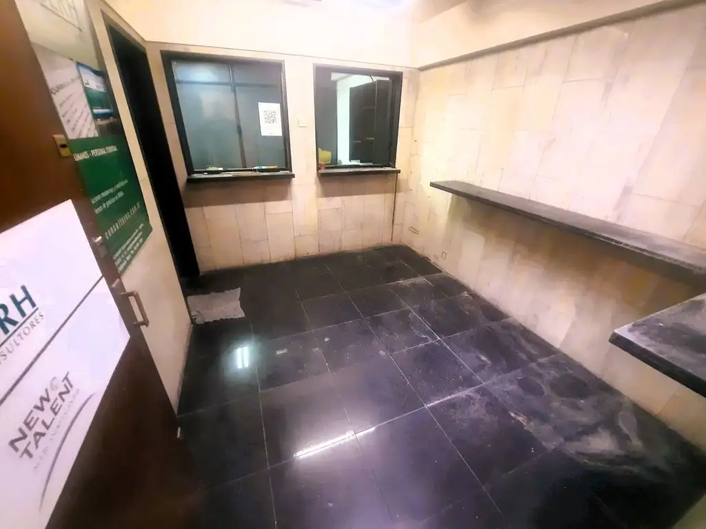 Hoy, en su formato de oficina, posee una amplia recepción con mostradores de mármol, vidrios blindados y puerta de seguridad. Este ambiente, unificado con dos de los despachos, se transformaría en un gran living comedor