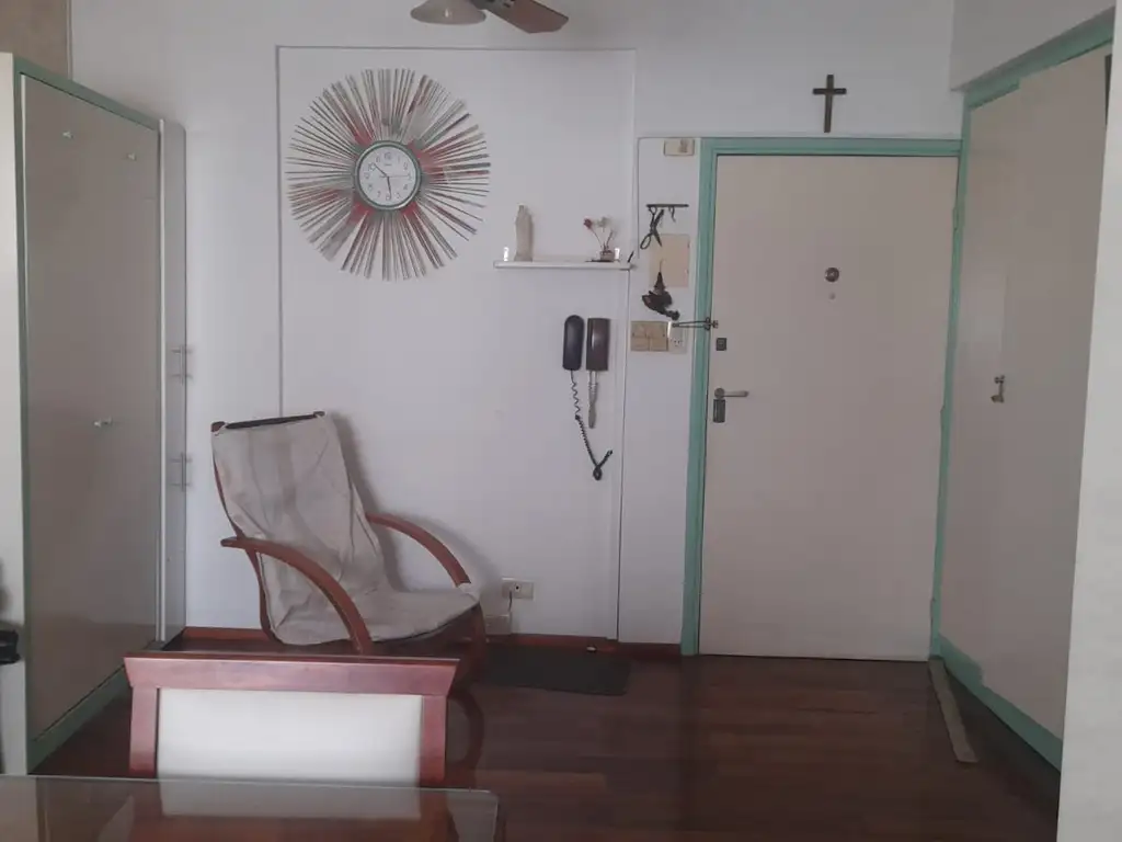 Departamento de 1 amb., 7º piso, al frente, muy luminoso, ventana con cortina black out, todo en perfecto estado, pisos de madera tarugados, ambiente con 2 ventiladores de techo y aire acondicionado frio. Cocina Kichinet con cocina a gas y baño con ducha, bidet y extractor de aire.