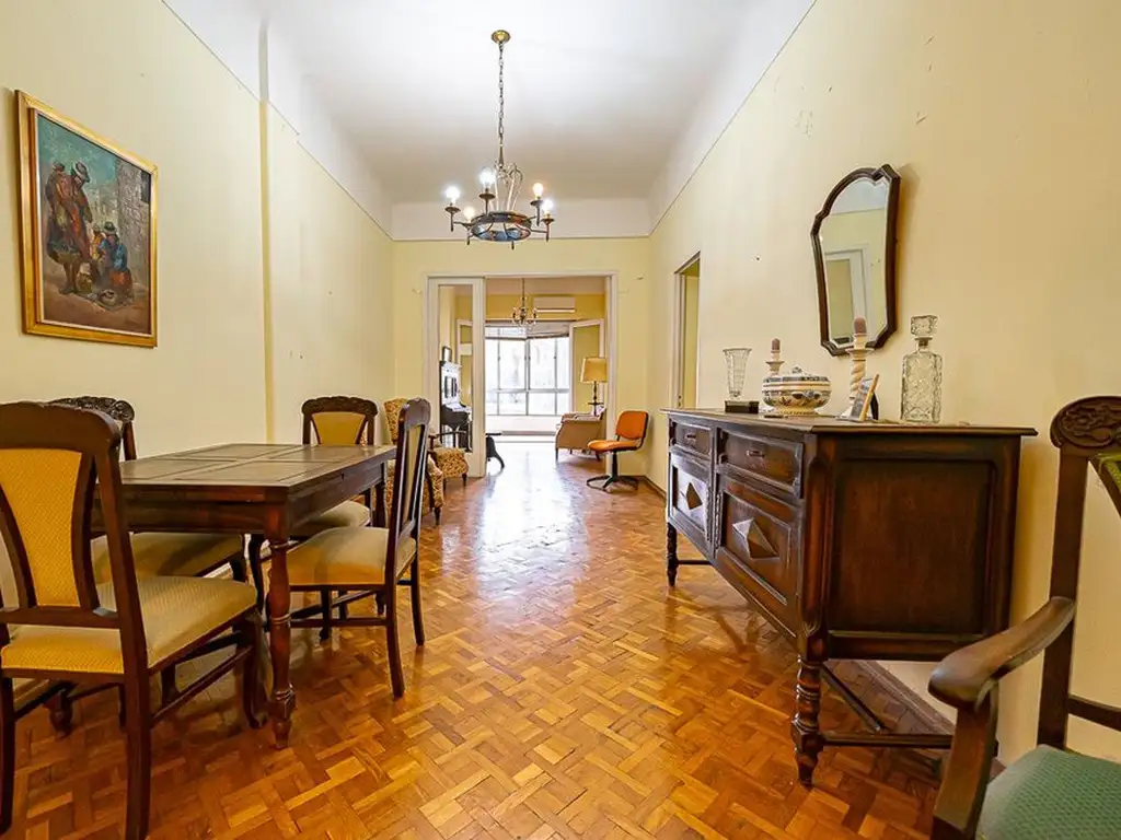 Living-Comedor: Muy amplio, luminoso y ventilado, con pisos de parquet y con salida a un balcón cubierto que puede funcionar como jardín de invierno, escritorio o espacio de relax. Cuenta con aire acondicionado.