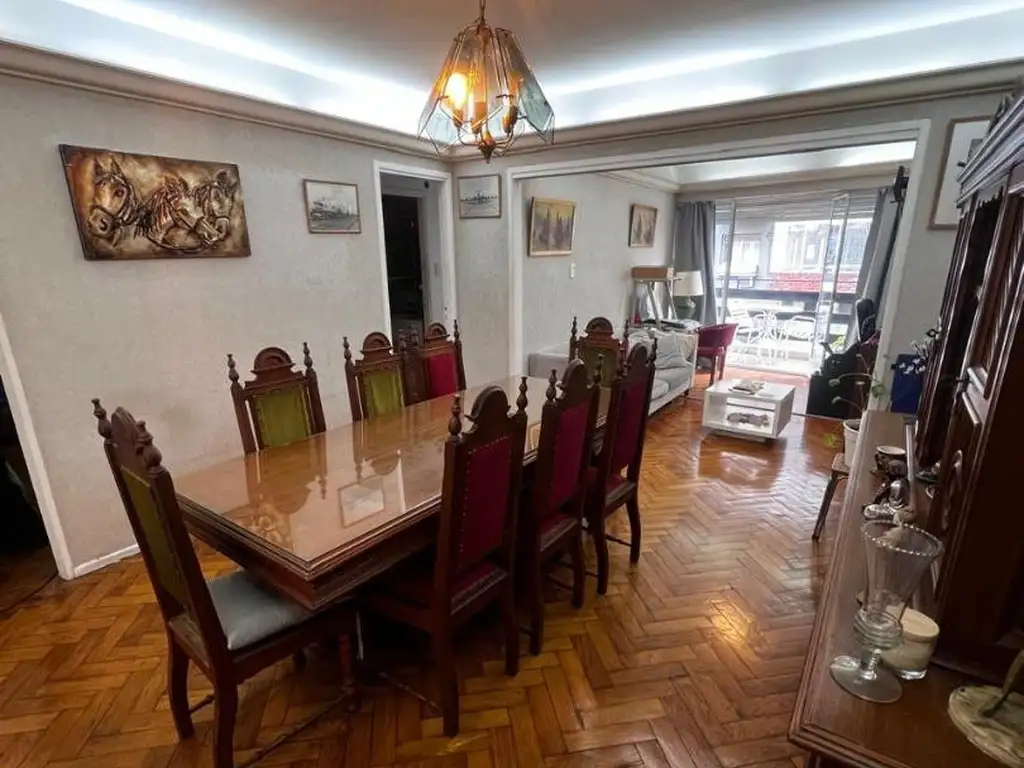 Living comedor con pisos de madera, salida a balcón corrido al frente.