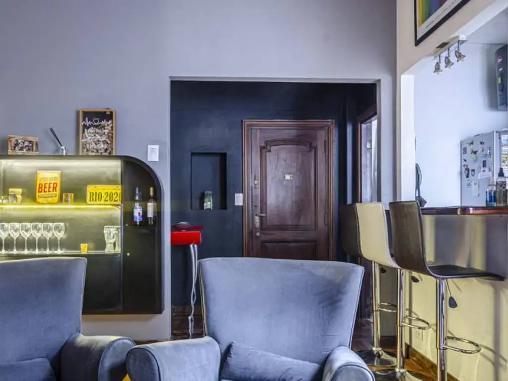 Living-comedor con salida a un pequeño patio. Dos dormitorios. Un baño completo. Pisos de parquet. Cocina con barra americana.