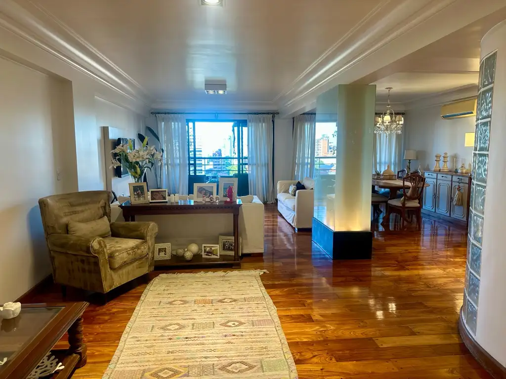 El living comedor, de grandes dimensiones y excelente luminosidad, se presenta en dos tiempos y cuenta con salida directa a un amplio balcón al frente, con vistas abiertas a la calle Muñecas y a las copas de los árboles de Plaza Urquiza, generando una conexión única entre ciudad y verde.