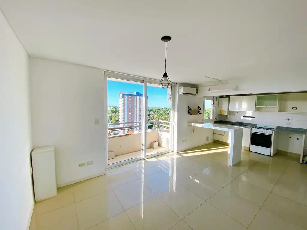 El departamento es muy luminoso y tiene una hermosa vista abierta desde su balcón. La cocina está integrada con una barra desayunadora y cuenta con un amplio espacio de guardado. Además, hay un espacio para colocar el lavarropas.