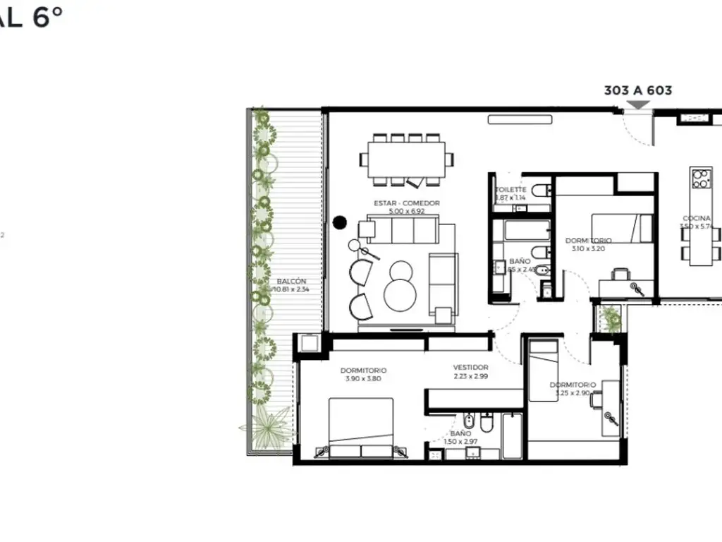 UNIDAD 303 -Cuatro ambientes con toilette, dorm. ppal. en suite y balcón terraza con parrilla al frente