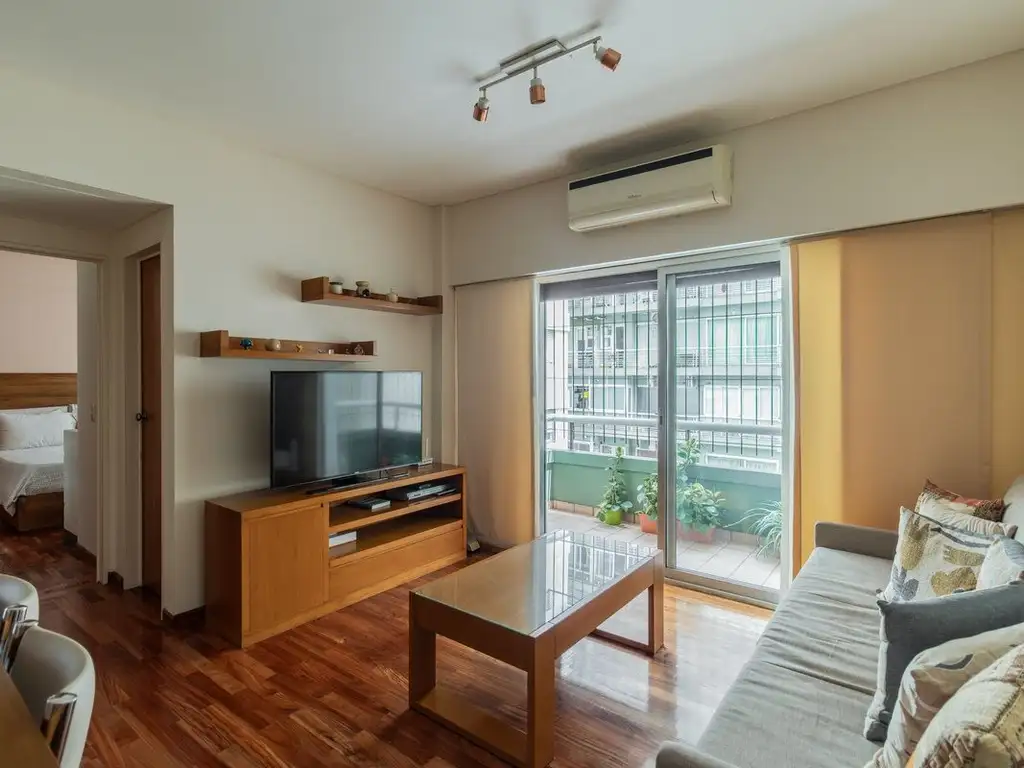 La distribución inteligente maximiza cada metro cuadrado. El dormitorio, revestido con piso de madera, ofrece un placard a medida. El living se expande hacia un balcón con vista al contrafrente, creando una conexión natural entre el interior y el exterior.