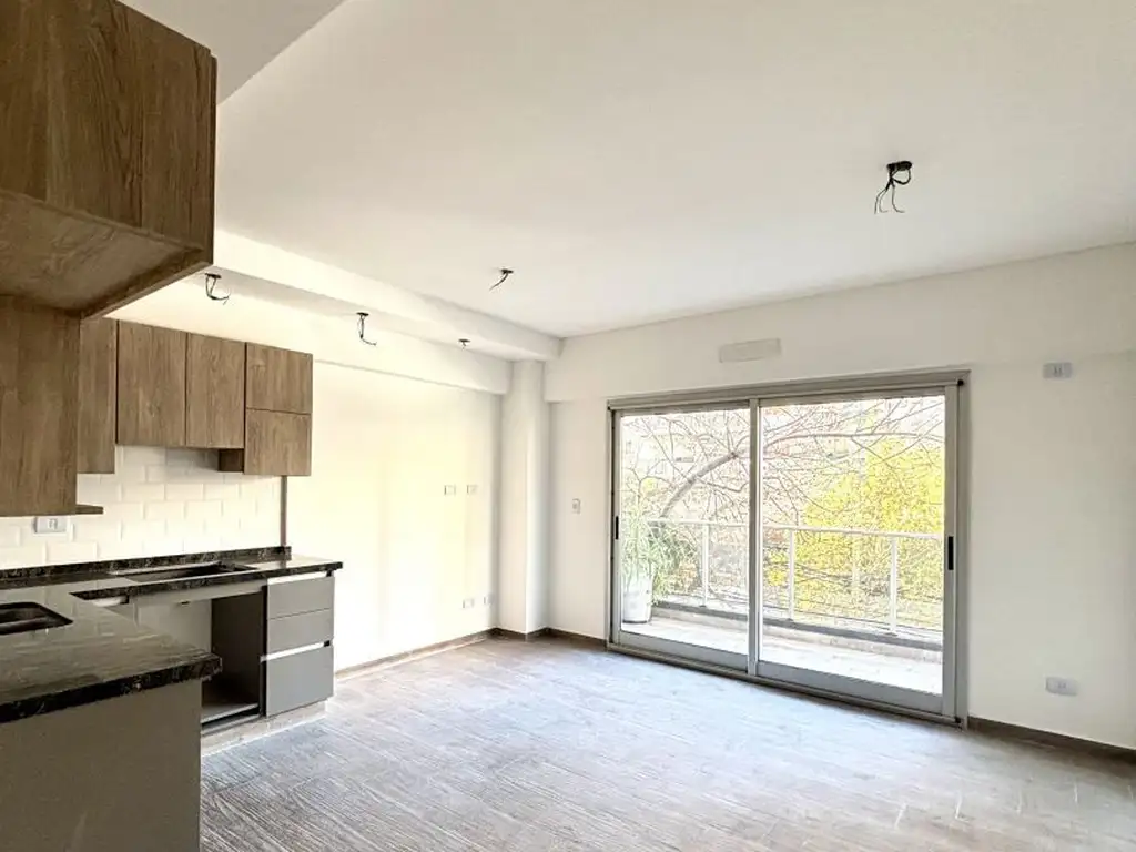La unidad cuenta con amplio living comedor con cocina integrada con mobiliario completo (se entrega con horno empotrado y 4 anafes), dormitorio con placard (con interior completo), baño completo (con bañera), y gran balcón con vistas al boulevard de Honorio Pueyrredón. Cuenta también con una baulera propia ubicada en el subsuelo del edificio, y equipo de aire acondicionado ya instalado en cada ambiente (living y dormitorio).