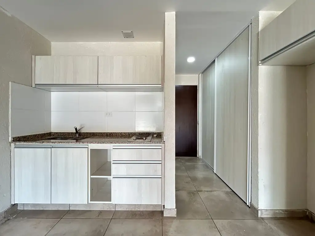 - Sector de cocina con muebles bajo mesada y alacena, bacha de lavado y anafe eléctrico