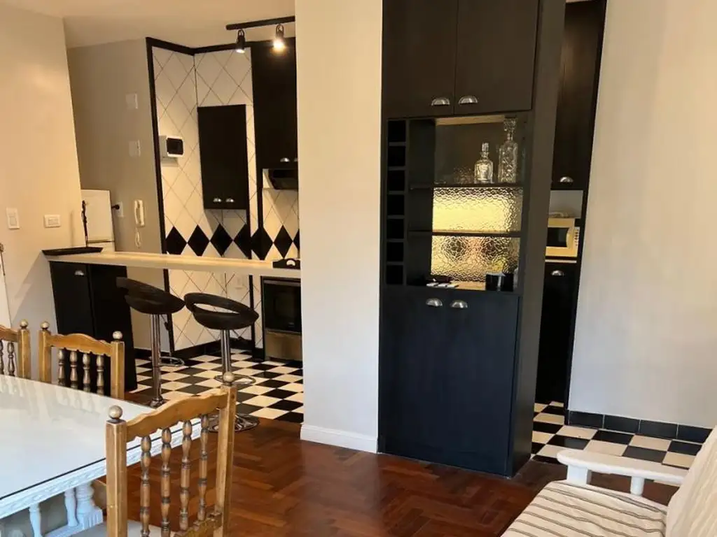 ? Cocina incorporada al living mediante barra desayunadora, con diseño moderno en tonos blanco y negro. Cuenta con gran capacidad de guardado (muebles superiores y bajos), artefacto de cocina a gas, doble alacena, espacio para heladera y un pequeño sector tipo despensa.