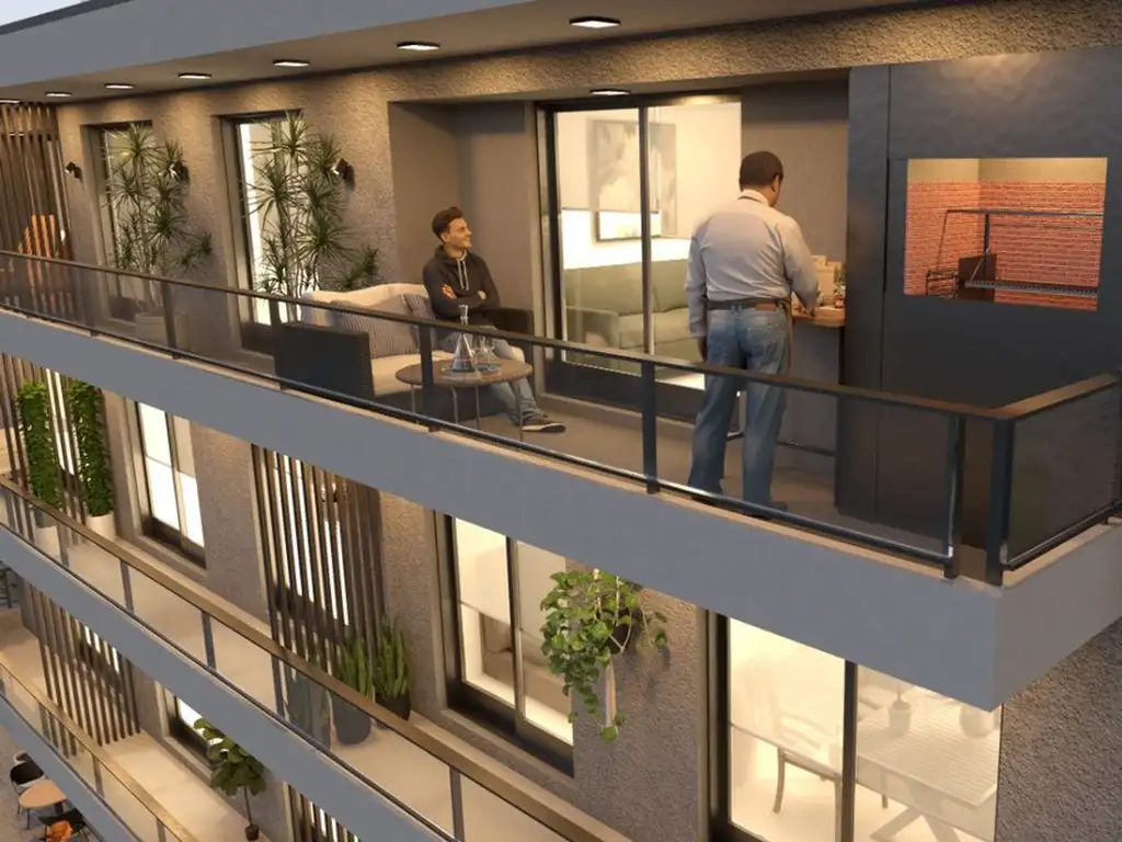 Amplio living comedor con cocina integrada, 2 baños completos, 2 habitaciones con placares y balcón al frente con parrillero.
