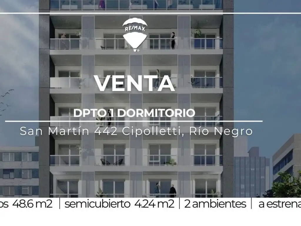 Departamento de 2 ambientes de 65 m² totales en desarrollo inmobiliario con ubicación estratégica en pleno centro de Cipolletti. Proyecto arquitectónico contemporáneo emplazado sobre calle General San Martín 442, con diseño integral que combina funcionalidad y estética moderna.