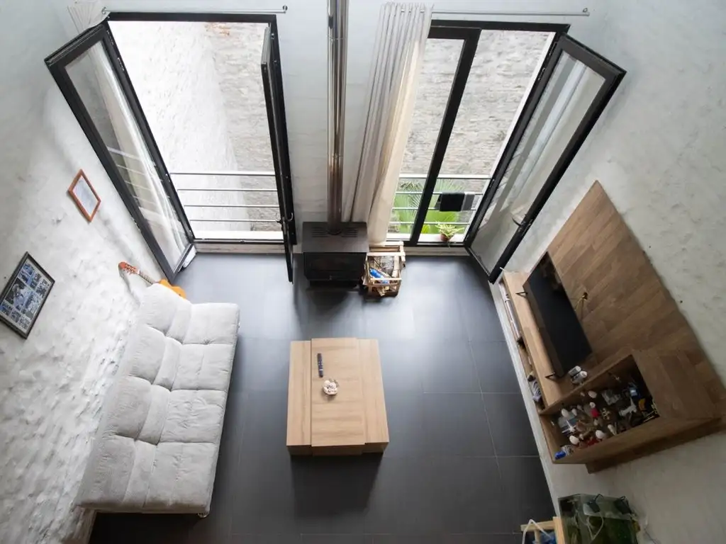 La unidad se desarrolla en primer piso por escalera y se destaca por su diseño contemporáneo y excelente luminosidad. En planta baja cuenta con un amplio living con cocina integrada, con mobiliario bajo mesada y aéreo, y grandes aberturas que dan hacia un patio trasero, aportando muy buena ventilación y luz natural. El ambiente dispone además de estufa de alto rendimiento.