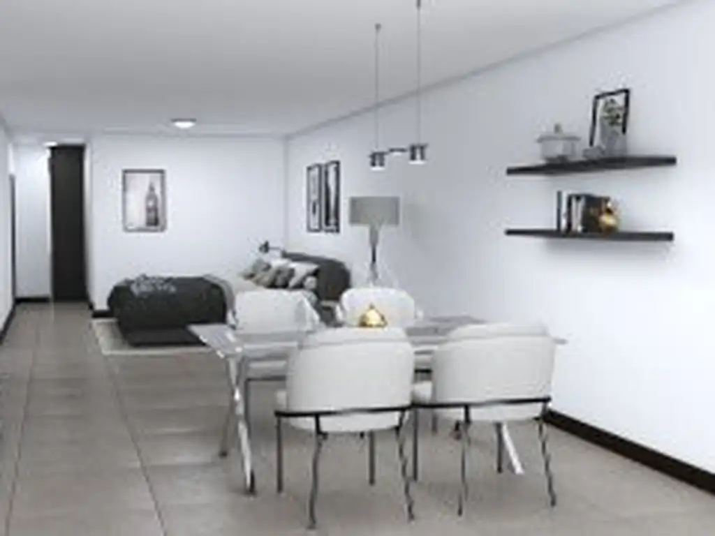 Pisos porcellanatos en estar, cocina, baño y balcón y mono ambientes y pisos flotante en dormitorios.