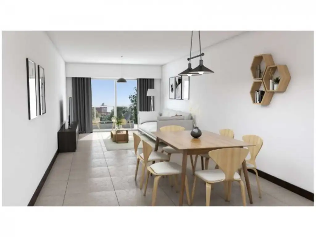 Pisos porcellanatos en estar, cocina, baño y balcón y mono ambientes y pisos flotante en dormitorios.