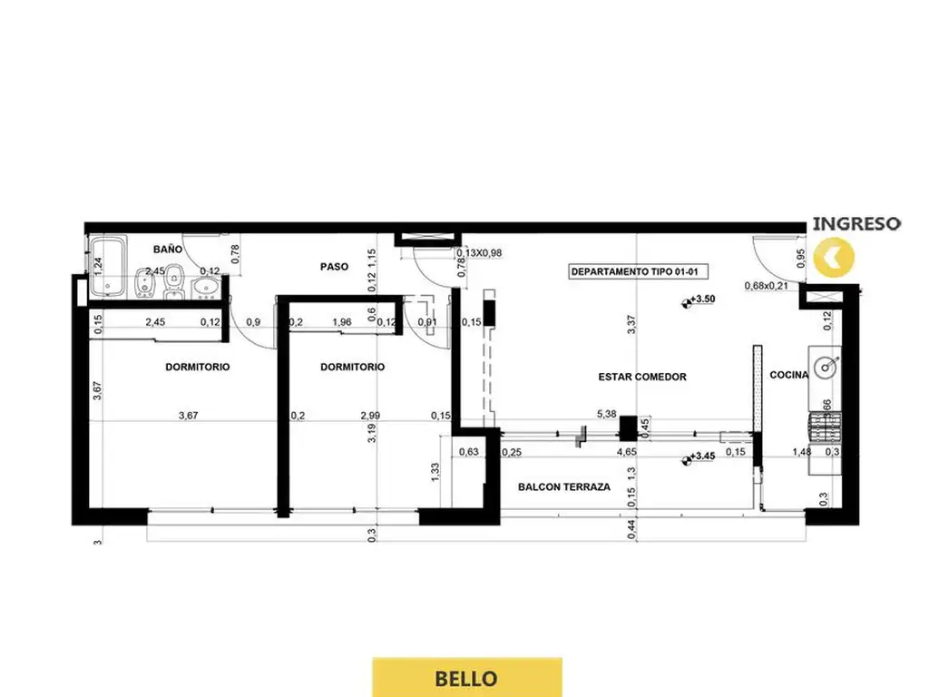 Estar comedor con amplio balcón terraza al frente. Cocina semi separada con ventilación al exterior. Sector íntimo compuesto por dos dormitorios con placard y ventanal hacia calle Bello. Baño completo.