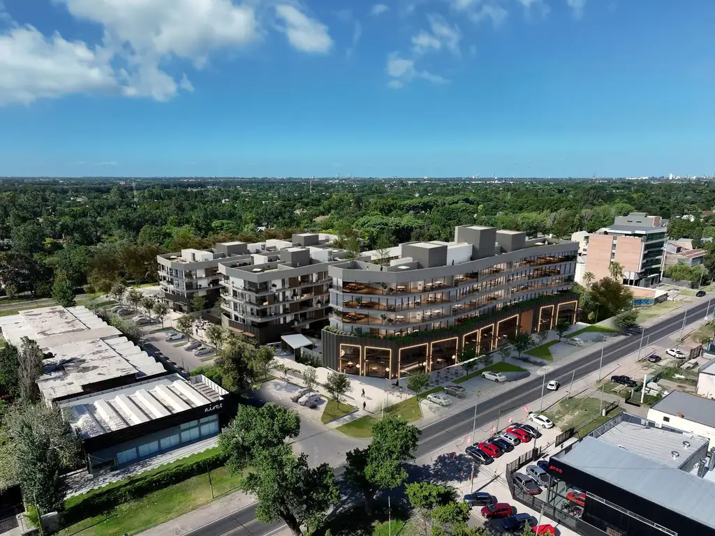 Proyecto: El conjunto se compone de tres volúmenes. El primero está compuesto por planta baja y cinco pisos, destinado a diferentes usos. Sobre Av. Eva Perón, se encuentran las oficinas y, en planta baja, los locales comerciales. Hacia el interior de la manzana, se encuentran las unidades residenciales. El segundo está compuesto por un local comercial de gran dimensión en planta baja y cuatro pisos. El tercero también cuenta con un local comercial en planta baja de similiares dimensiones y tres pisos. Las unidades residenciales, con vista a los grandes y forestales espacios comunes, se distribuyen en tipologías de 1, 2 y 3 dormitorios. El paseo de locales comerciales creará un gran polo gastronómico. El proyecto cuenta con amenidades de primer nivel: Vestuarios, sum, pileta climatizada, gimnasio, sauna, áreas verdes, parque infantil, fogoneros y demás.