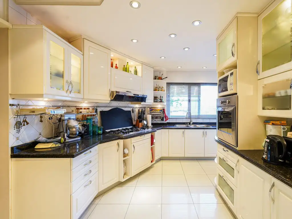 La cocina independiente, completamente equipada, presenta muebles laqueados blancos, anafe, horno y extractor Ariston, amplias mesadas de mármol, bacha doble, grifería de primera línea y alacenas en excelente estado.