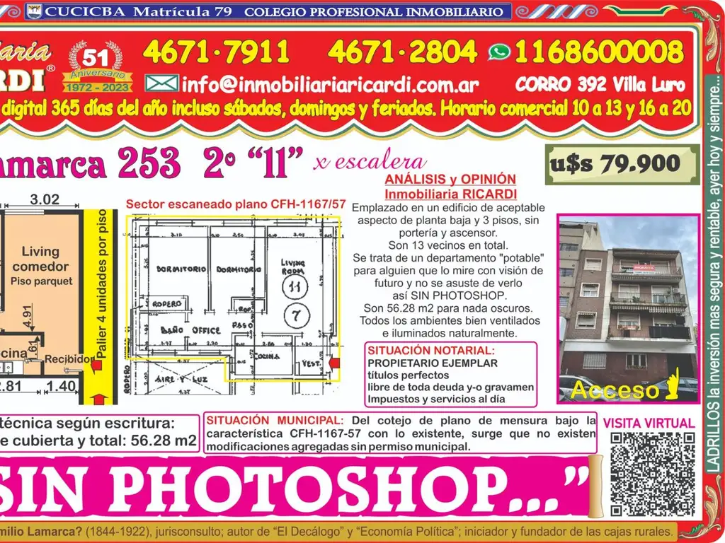 La Inmobiliaria RICARDI NO garantiza que el inmueble cumpla con el certificado de conservación de fachadas y balcones (Ley 257) tampoco efectúa el estudio de títulos, ni analiza los alcances del Código de edificación y no será responsable por los vicios ocultos o redhibitorios que competen a quien corresponda. Advertimos al adquirente que las instalaciones eléctricas, de gas natural y-o sanitarias pueden NO solo no tener un correcto y adecuado funcionamiento técnico sino que además puede NO cumplir con las exigencias actuales de METROGAS- EDESUR- EDENOR - siendo a cargo del adquirente que implique su puesta en valor y-o funcionamiento.