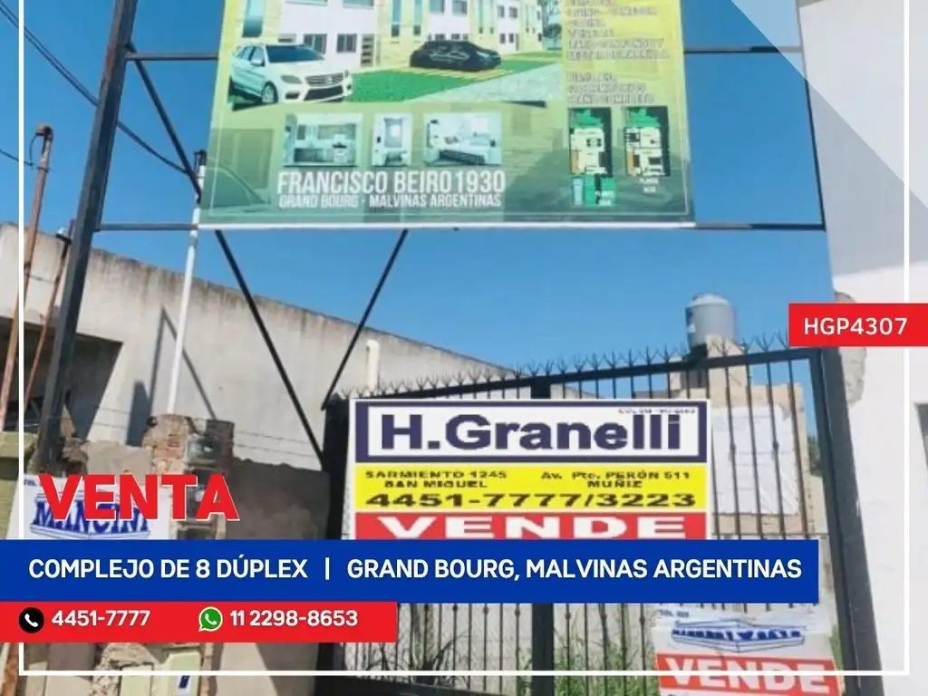 Complejo de ocho dúplex de tres ambientes, planta baja : que cuenta con entrada de auto, living comedor, toilette, cocina, en planta alta: dos dormitorios con baño completo. Patio con lavadero y parrilla.