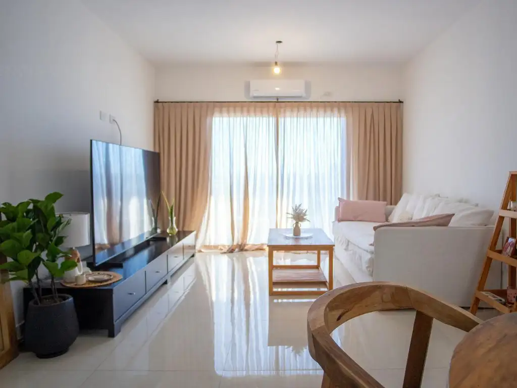 Es un departamento con tonos claros y pisos de porcelanato, lo que lo hace un hogar muy cálido y además cuenta con un amplio living comedor con balcón corrido con orientacion norte , toilette de recepcion, cocina separada equipada con muebles de alacena y bajo mesada. La mesada es de gris mara, cuenta con conexión y desague preparado para lavarropas, ya se encuentra instalado el artefacto de cocina y su extractor.