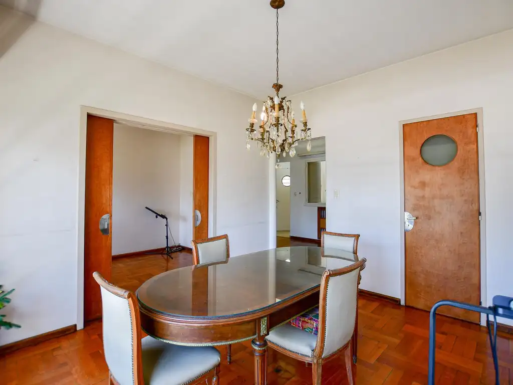 El área principal cuenta con comedor amplio, living con salida al balcón y un escritorio con posibilidad de integrarse al living o comedor. La cocina, con doble mesada, se conecta al lavadero, al toilette y a la habitación de servicio.