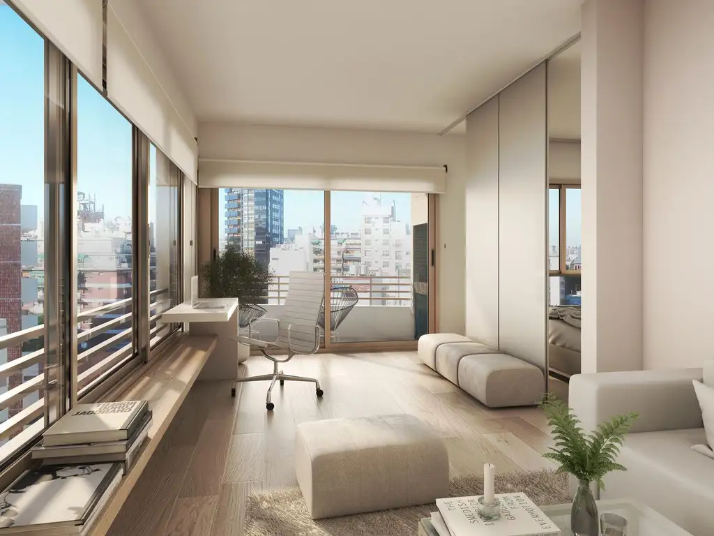 Hall de entrada. Amplio y luminoso monoambiente divisible con balcón al contrafrente con parrilla, se entrega dividido con un panel corredizo. Toilette de recepción. Living comedor con salida a balcón. Cocina americana con muebles completos, horno y anafe eléctricos. Dormitorio con baño en suite y vestidor. Equipos de aire acondicionado frío calor inverter. Carpinterías con doble vidrio hermético DVH. Instalación preparada para la instalación de lavarropas o lavavajillas.