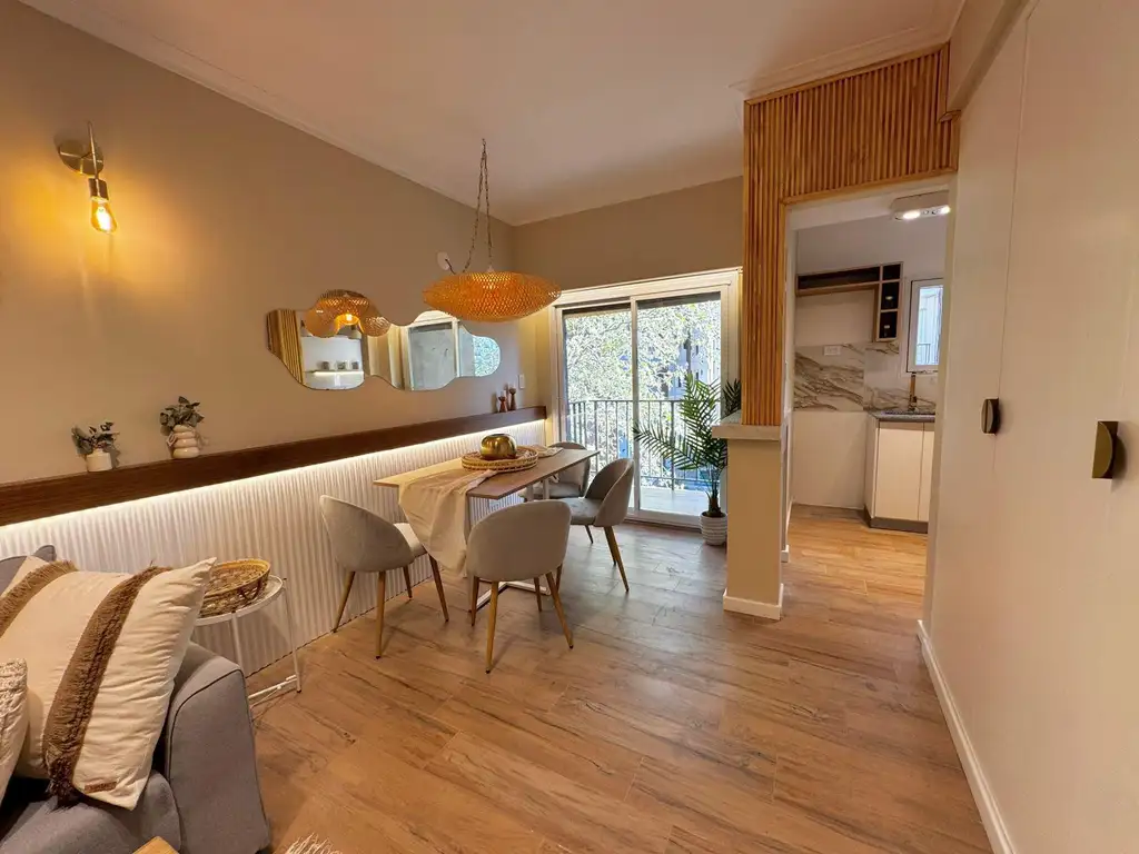 Al ingresar, te recibe un ambiente amplio y luminoso, finamente decorado, con pisos y revestimientos en porcelanato. La cocina semi integrada cuenta con barra desayunadora, amplio placard con espacio para lavarropas y detalles de diseño que aportan funcionalidad y estilo.