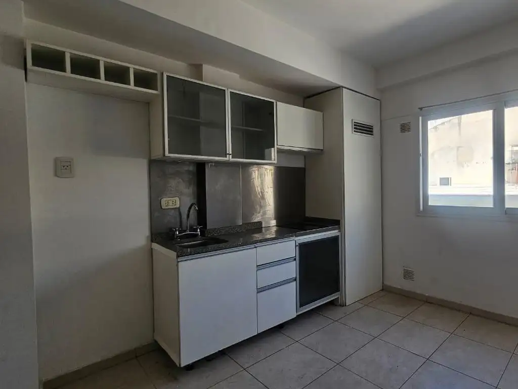 Ambiente único con buena iluminación natural, cocina integrada, baño completo y espacio para sector de descanso y estar.
