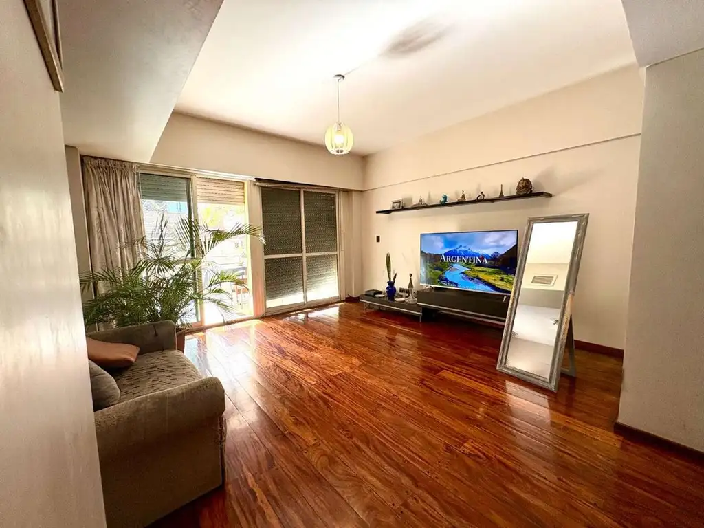 A la izquierda del ingreso al depto y próximo a la cocina se encuentra el imponente living-comedor, el garn espacio común que posee el depto con capacidad para albergar gran cantidad de personas en caso de visitas y de alta comodidad para el día a día. Desde su excelente amplitud hasta su piso elegante de parqué, sumado a la gran luminosidad gracias al balcón al frente, hacen de este ambiente el mas vistoso del depto; y en el cual se encuentra también un toilette ideal para las visitas.