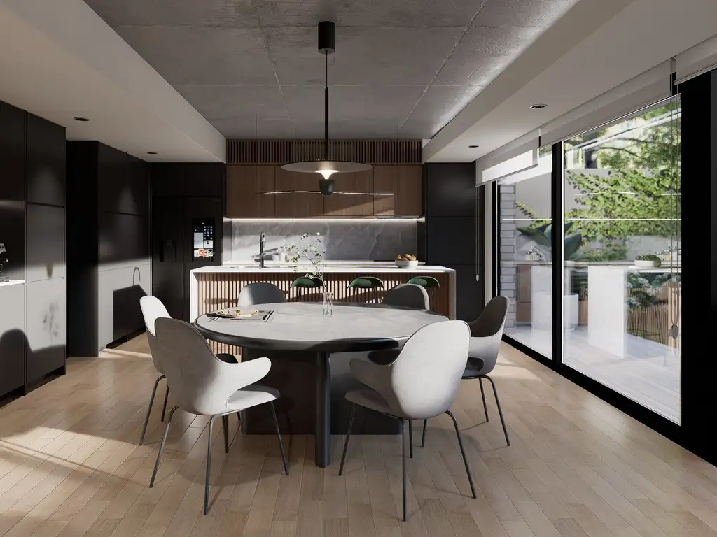 En la planta Alta se ubican tres dormitorios al contrafrente: la suite principal con vestidor, y dos habitaciones adicionales con baño completo compartido. Todos los ambientes cuentan con grandes ventanales y balcón corrido, garantizando luminosidad y vistas abiertas. Cada piso tiene un acceso independiente desde la circulación principal del edificio, lo que brinda mayor flexibilidad e independencia a la unidad.
