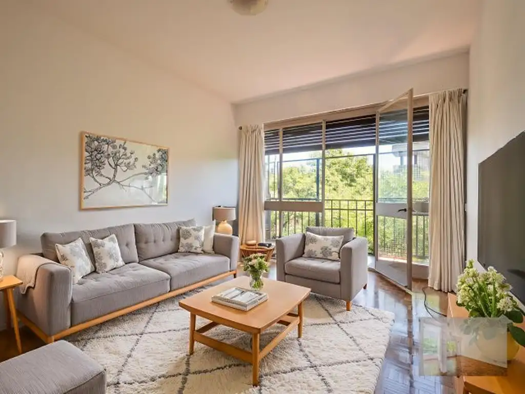 Ingresamos por un espacioso living comedor con pisos de parquet en muy buen estado, y salida a un balcón con orientación norte y vista a copa de árboles que le da privacidad, vista verde y excelente ventilación.