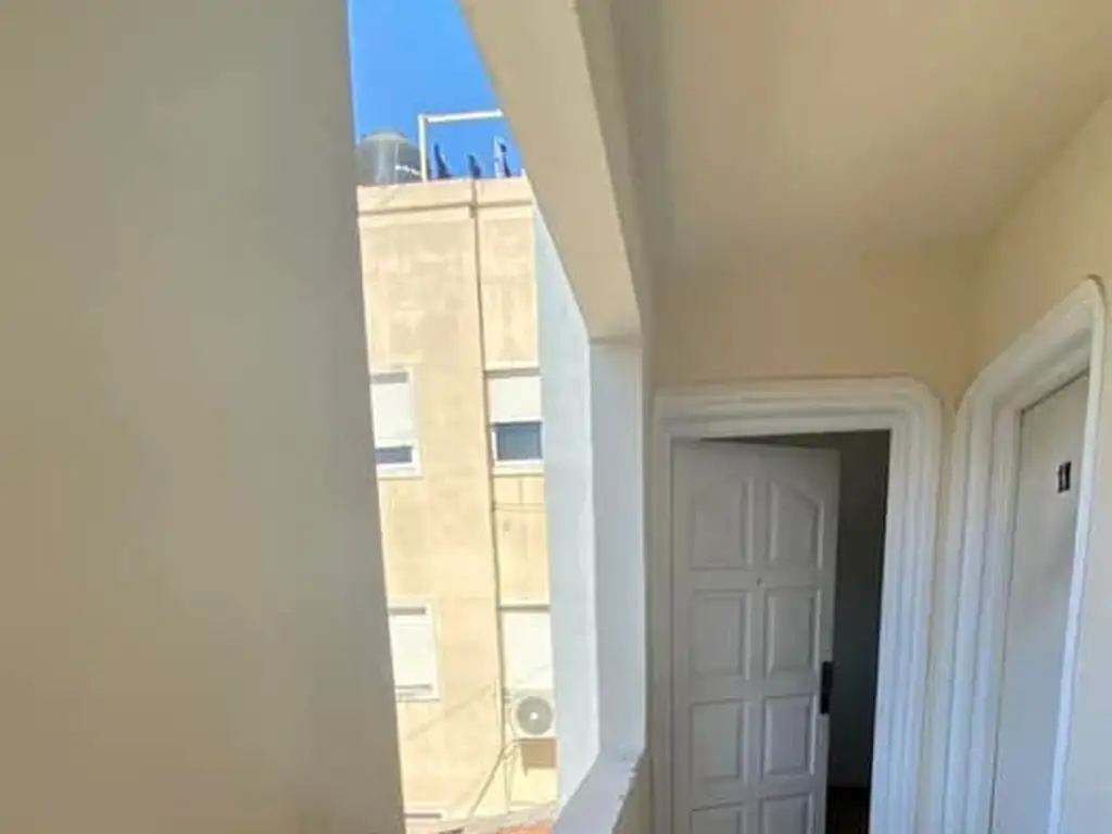 Departamento de 2 ambientes en primer piso por escalera, dispone de cocina comedor con amoblamiento de bajo mesada + alacena + barra desayunadora. Dormitorio con placard. Baño completo con conexión de lavarropas.