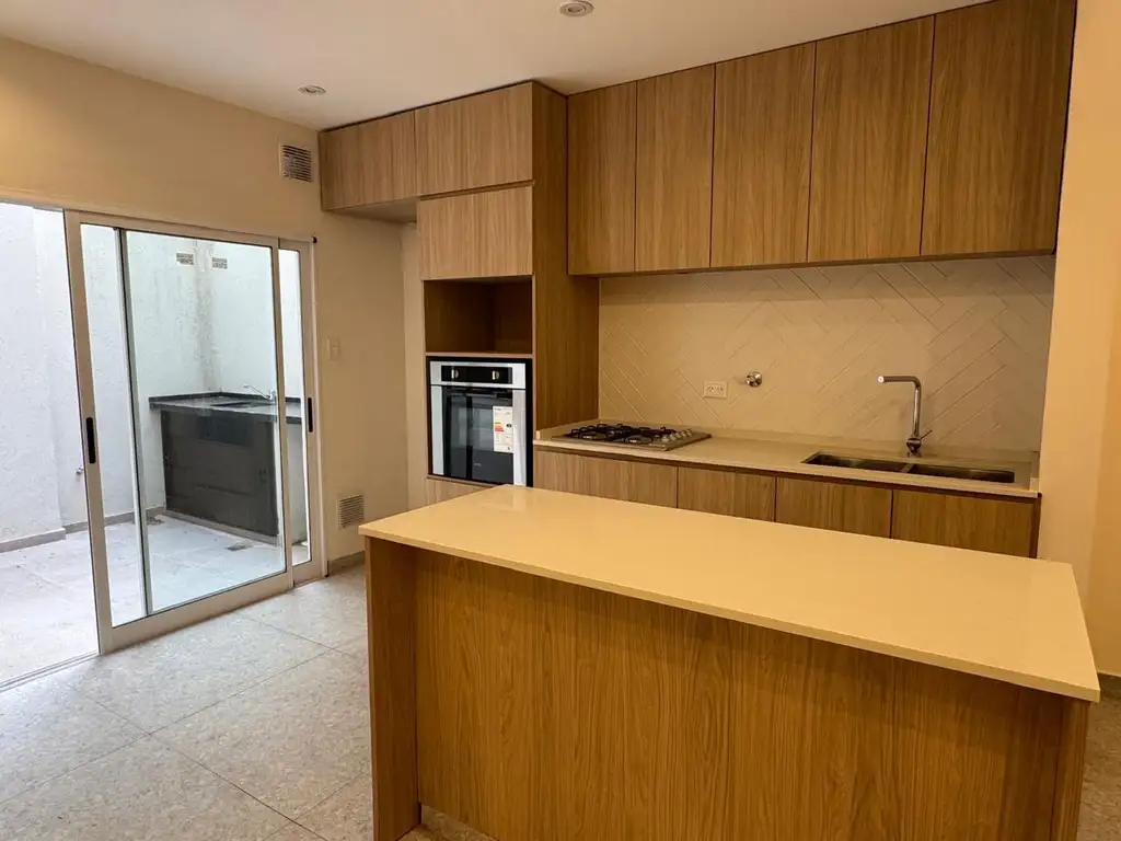 Living comedor con cocina integrada. Alacenas y mueble bajo mesada. Toilette. Pisos de Porcelanato. Mesada de Silestone.