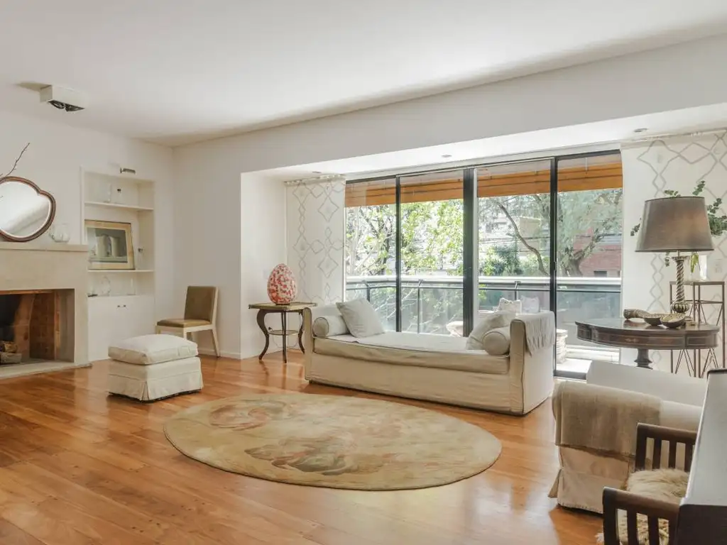 Palier privado, amplio living apaisado con hogar, salida a balcón aterrazado, comedor en L. Pisos de madera entarugados en excelente estado. Toilette. Tres dormitorios, el principal en suite con salida a balcón aterrazado a contrafrente con vestidor y baño compartimentado. Otros dos dormitorios, uno con salida al balcón, el otro con salida al patio, ambos comparten otro baño completo compartimentado. Doble circulación. Amplia cocina con comedor diario, lavadero y dependencia, todo con salida al patio. Seguridad 24 hs. Cochera fija y baulera.